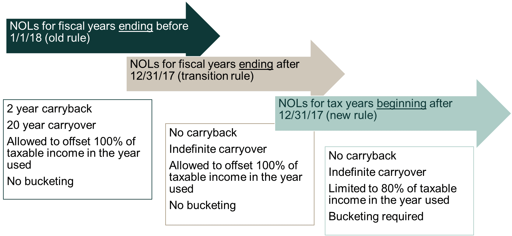 • NOLs generated in years beginning after December 31, 2017 cannot be carried back, and can be carried forward indefinitely. However, the loss can only offset up to 80% of taxable income in the year used, and can only offset income from the activity generating the loss.