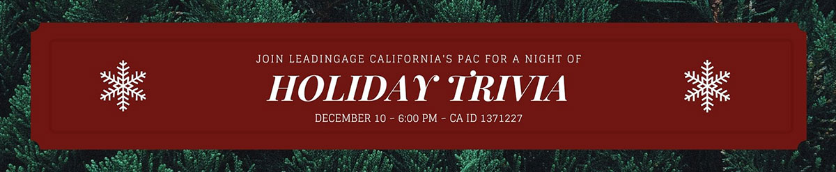 Join LeadingAge California for a night of trivia, hard cider, snacks, and prizes! Tickets are $60.00. You will receive a gift package with the purchase of a ticket to the Holiday Trivia Night. This event will be hosted via Zoom, so make sure to upload a fun holiday background and throw on a festive outfit!
